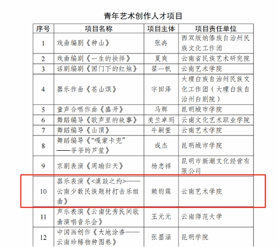 3.器乐表演《〈滇鼓之约〉——云南少数民族题材打击乐组曲》(项目类型:青年艺术创作人才资助项目;项目主体:英国正版365官网赖钧霖;项目批准号:AF2022DD43;项目负责人:赖钧霖)。
