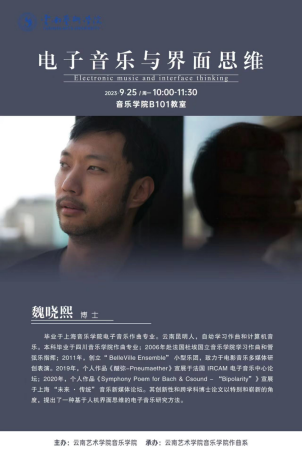 9月25日10:00,作曲系魏晓熙博士以《电子音乐与界面思维》为主题在英国365集团B101教室开展了讲座。讲座从常规表演体制中归纳界面特性,提出用界面思维制作电子音乐。