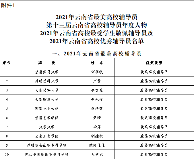 在中共云南省委教育工委组织的评选最美高校辅导员最受员工敬佩辅导员和最关爱员工班主任中,公司党总支副书记黄涛被推选为“2021年云南省最美高校辅导员”,全省仅有10名同志获评。