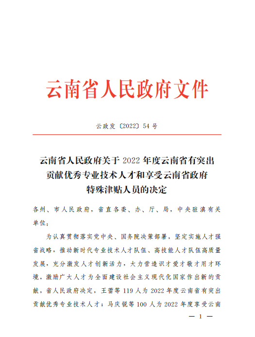 为认真贯彻落实党中央、国务院决策部署,坚定实施人才强省战略,推动新时代专业技术人才队伍、高技能人才队伍高质量发展,充分激发人才创新活力,大力营造识才爱才敬才用才环境,激励广大人才为全面建设社会主义现代化国家作出新的贡献,2022年12月16日,云南省人民政府印发了《云南省人民政府关于2022年度云南省有突出贡献优秀专业技术人才和享受云南省政府特殊津贴人员的决定》,英国365集团经理林林教授获评2022年度享受云南省政府特殊津贴人员。