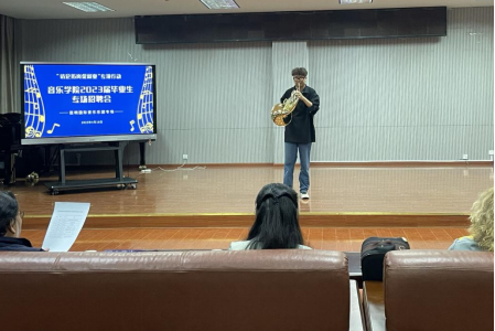 接着,管弦系的毕业生参加了昆明国际爱乐乐团招聘的现场面试,面试内容包括自我介绍和现场演奏一首曲目。参加面试的毕业生主要涵盖小提琴、长笛、圆号、中提琴、大提琴乐器演奏七个专业方向。